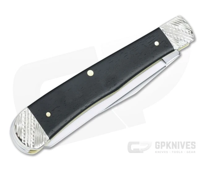 Handle: Smooth, black Ebony wood covers are fit between two sets of nickel silver bolsters that have been tool worked for a textured feel and custom look. Ebony has a warm, organic feel in hand with solid durability and weather resistance. The covers are attached with brass pins to brass liners in the traditional style. The front cover sports a Case Bow Tie shield while dual stainless steel back springs deliver smooth, simple and secure slip-joint operation.