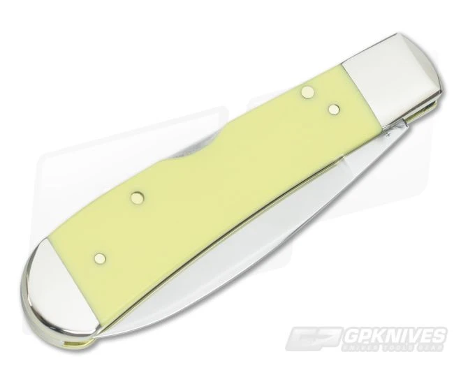 The Handle: Nickel Silver bolsters frame classic Yellow Delrin covers fitted with brass pins to brass liners. The front cover sports an Oval Shield. A mid-back lock allows for easy, one-hand operation and provides simple and secure operation of the knife while in use.