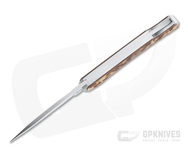 Handle: Brushed stainless steel slabs form the sleek and sturdy handle housing the blade and back spring. Dual wood overlays give a warm feel and added traction with the handles sitting proud for a more contoured feel while maintaining a thin profile. The front overlay is lasered with a camouflage pattern for visual appeal. A simple back lock mechanism provides smooth operation and solid lockup for safe use.