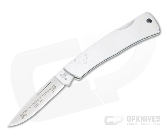 This slim vintage 1989 Case XX Centennial Lockback has brushed stainless steel handles and satin finished stainless steel blade with “Case XX Tested Centennial 1889-1989” etch. Knife only.