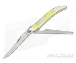 Case Fishing Knife with yellow synthetic delrin handles and Tru-Sharp stainless steel long clip and scaler blades. Clip disgorger and hook sharpener. Nail nicks for easy opening of blades. Nickel silver bolsters and brass liners.