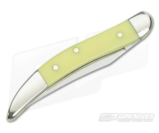 Case Small Texas Toothpick with yellow synthetic delrin handles and chrome vanadium carbon steel long clip blade. Nail nick for easy opening of blade. Nickel silver bolsters and brass liners.
