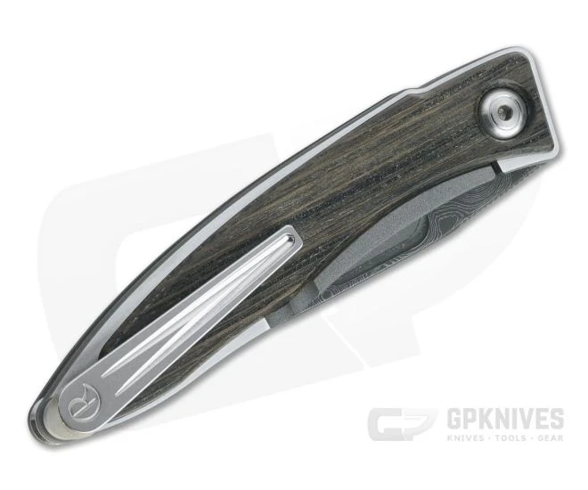 Blade: Stunning Nichols stainless Damascus and a crowned spine give the Mnandi a handsome, striking look while the shallow hollow grind offers exceptional slicing performance. A large thumb recess allows for quick, two-hand access to the blade with buttery smooth action thanks to oversize phosphor bronze washers at the pivot and very tight tolerances.