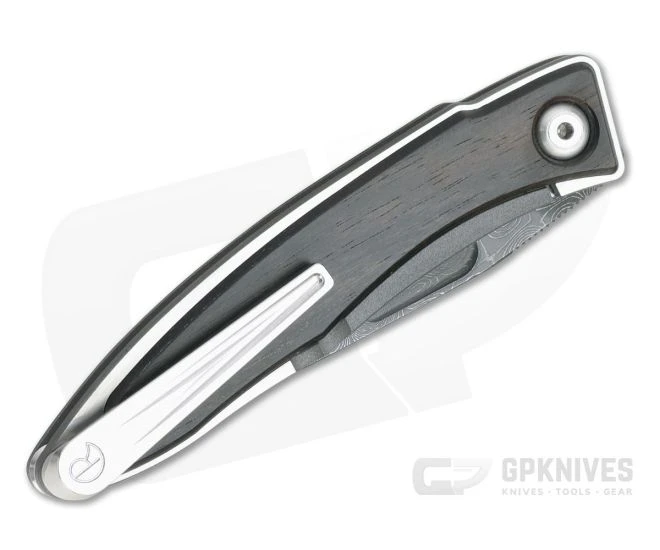 Blade: Stunning Nichols stainless Damascus and a crowned spine give the Mnandi a handsome, striking look while the shallow hollow grind offers exceptional slicing performance. A large thumb recess allows for quick, two-hand access to the blade with buttery smooth action thanks to oversize phosphor bronze washers at the pivot and very tight tolerances.
