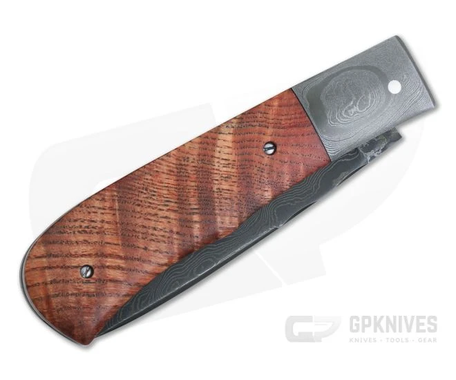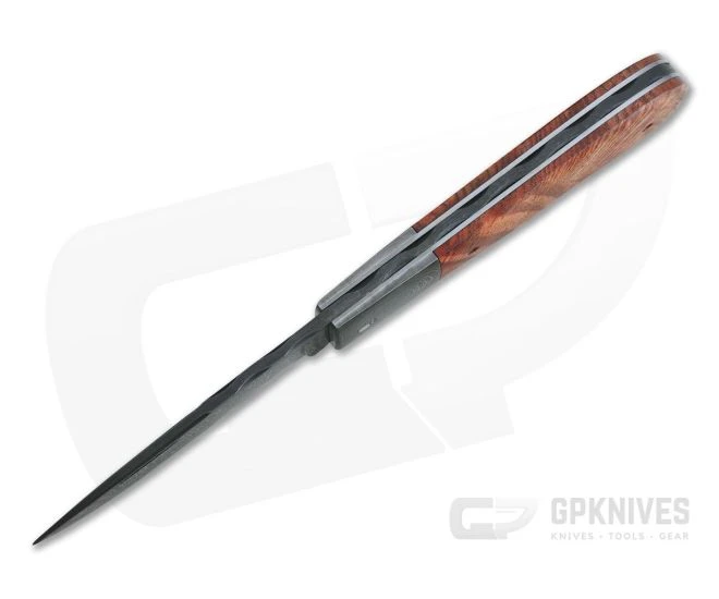 Blade: Hawes hand forged Damascus combines 160 layers of 1095 and L6 high carbon steels creating a unique Burl pattern. The Remington-style drop point blade is opened with single nail nick and comes with a razor sharp convex grind. The forward swedge and file work along the spine adds a custom feel. The blade opens with a pronounced half stop with strong Damascus back spring construction.