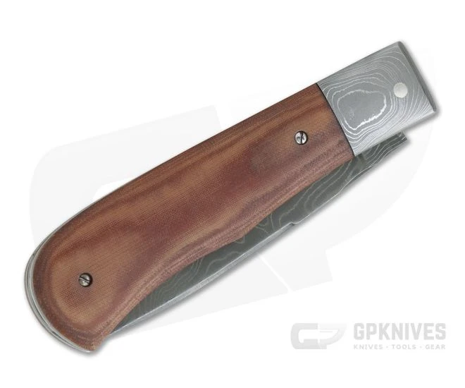 Handle: Brown Linen Micarta handle scales are attached to stainless steel liners and flush fit to Damascus steel bolsters for a striking yet classic look. A full length Damascus back spring rounds out the handle construction and is embellished with the same file work found on the spine of the blade.