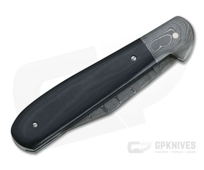 Handle: Stainless steel liners support polished Double Black Canvas Micarta handle scales and Damascus steel bolsters all meeting seamlessly. A full length Damascus backs spring rounds out the handle construction and is embellished with the same file work found on the spine of the blade.
