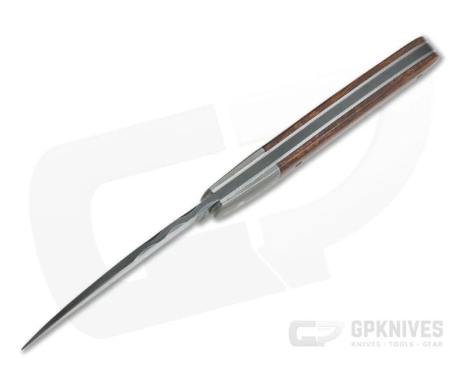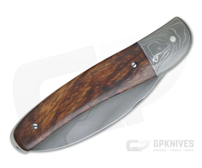 The Chuck Hawes Custom Wharncliffe Whittler is a custom design by Hawes and offers his modern take on this classic slip joint design. Strikingly figured Ironwood handle scales are flush fit to Damascus bolsters over stainless steel liners. The handles house a razor sharp, W2 carbon steel blade with Hamon line and custom file-work.