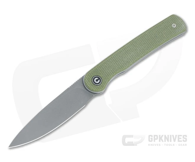 Designed by Ferrum Forge Knife Works, the CIVIVI Stylum is a slim, utilitarian detent slip joint offering modern front flipper deployment with gentleman’s style and solid performance. A flat ground, drop point blade handles a mix of cutting tasks with easy, while the proud liners and flat Micarta scales pair up for a comfortable and sleek handle. This version comes with a gray stonewashed stainless steel blade and olive canvas Micarta handle scales.