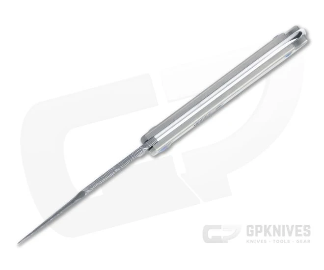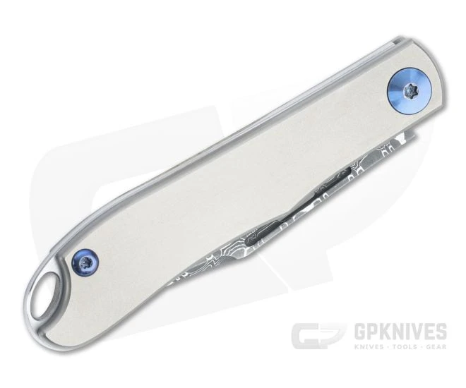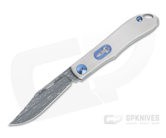 The classic Lanny’s Clip slip joint gets a modern makeover from D Rocket Design that makes this Mini Lanny’s Clip an ideal collector’s piece or dress carry folder. The clip point blade is delivered in impressive Vegas Forge Damascus with a more contemporary long pull nail nick. Handles consist of a polished and crowned stainless steel back spring and dual slabs of matte gray titanium for the scales accented with blue hardware and rocket logo laser engraved “shield”. One of the first production run of 24 pieces.