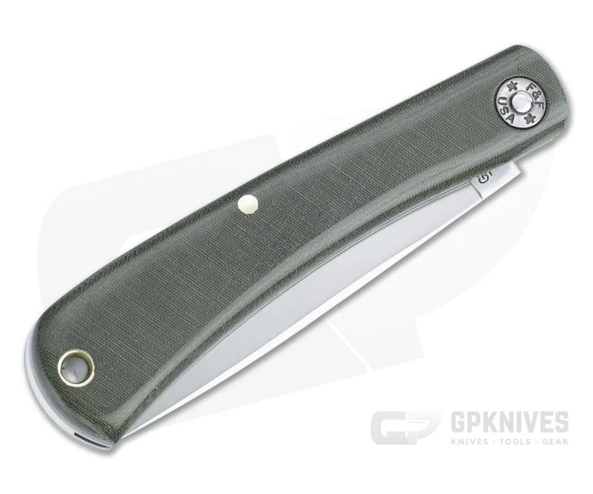 The Farm and Field Tool family of knives built by Great Eastern Cutlery are USA made cutting tools known for their hard-working quality and affordable price point. Based on the classic sod buster, the 71 Bullnose work knife is no exception. With a single carbon steel blade, stainless liners, strong back spring and hand filling handles this knife is ready to get the job done. This version comes with green linen Micarta handle scales.