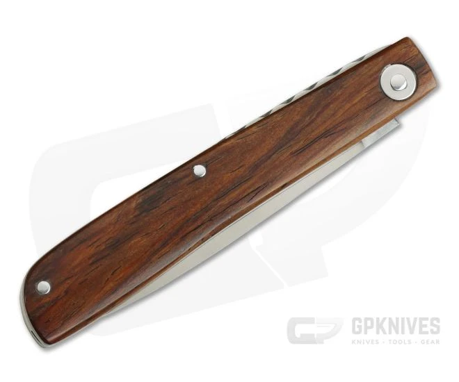 Handle: Handsome and durable, polished Cocobolo Wood handle scales are attached to polished stainless steel liners with matching pins. Half of the back spring rides proud to the liners and features decorative file work for a custom look and feel. The OLF has solid walk and talk and smooth operation. The slim construction of the OLF calls to mind a classic Bird & Trout knife but works well as an every day carry and utility folder.