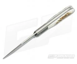 The Handle: The handles offer burly, jigged Titanium bolsters with integral titanium liners contoured Stag handle scales. A large Torx pivot and two Torx screws secure the handles together with a beefy, stainless steel back spring for secure and snappy operation. The bolsters, liners and pivot hardware have a rugged tumbled finish that goes great with the Stag handles while the back spring is satin finished for a touch of class. A large hole is provided for lanyard attachment.