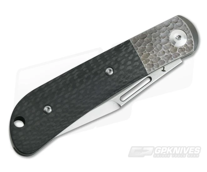 The Handle: The handles offer burly, jigged Titanium bolsters with integral titanium liners and contoured Carbon Fiber handle scales. A large Torx pivot and two Torx screws secure the handles together with a beefy, stainless steel back spring for secure and snappy operation. The bolsters and liners have a “Muddy” tumbled bronze anodized finish for an aged, vintage look. The back spring is satin finished for a touch of class that accents the elegant Carbon Fiber scales. A large hole is provided for lanyard attachment.