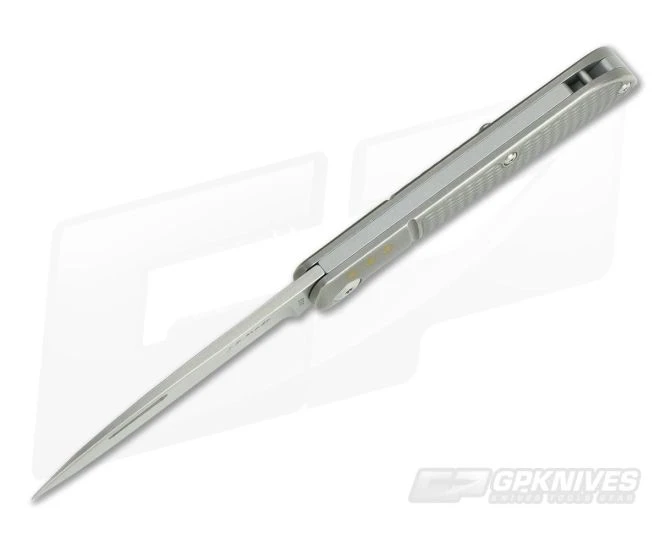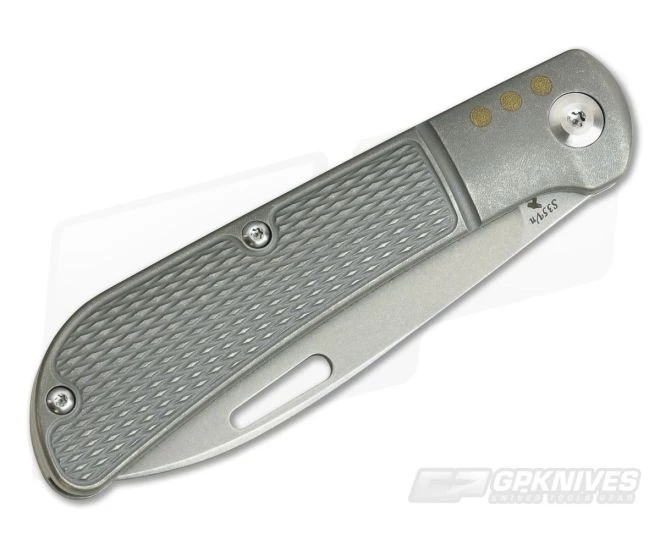 Handle: The full titanium handles are clean and ergonomic with a subtle dual guard and contoured shape for comfort. The handles are milled with smooth integral bolsters that have three brass inserts for a subtle touch of color. A classic diamond texture milling is used in place of traditional covers. The whole handle is finished with a matte grey blast and tumble finish. The stainless steel back spring delivers a snappy action opening and closing and an inline pin is included for lanyard attachment.