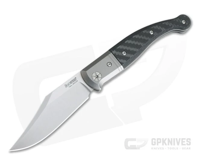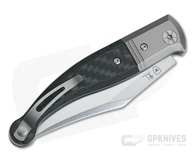 Handle: The Navaja-inspired design has a similar sweeping handle with titanium bolstered Carbon Fiber scales supported by crowned titanium liners. The back-spring is crowned and, along with the chamfered scales and bolsters, offer a very comfortable feel in the hand. The tapering handle provides a solid and secure grip while a subtle index guard provides some added safety. The moderate back spring tension delivers smooth pull with snappy half and full stops for secure use.
