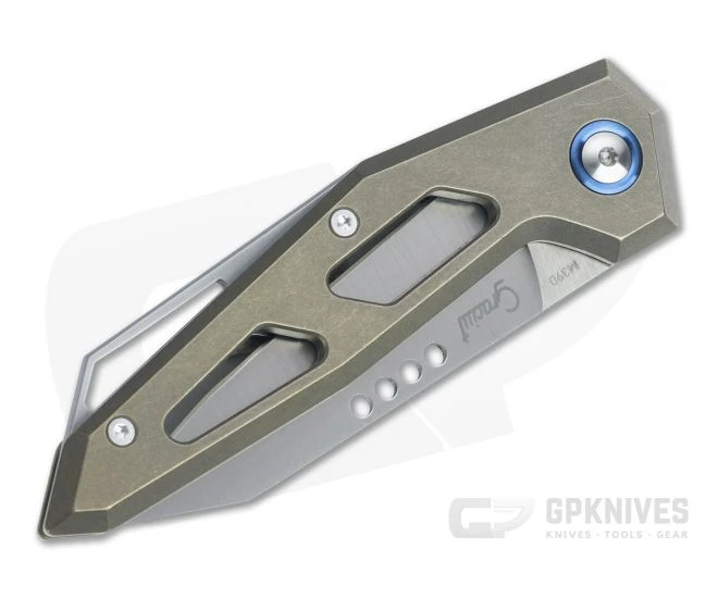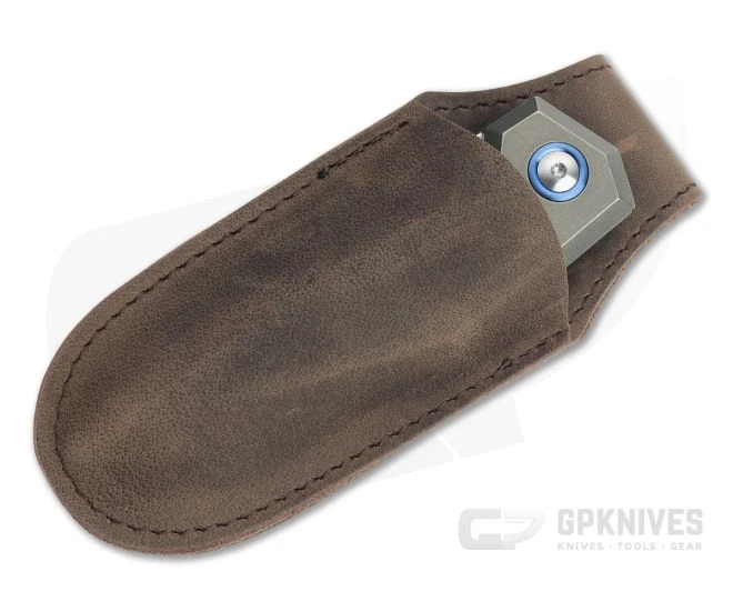 Handle: Dual slabs of titanium are chamfered for an ergonomic grip on the milled handle. Titanium delivers a nice heft in the hand while the rugged stonewashed bronze anodized finish offers visual appeal. Angular milled windows give a nice visual appeal and traction in the hand that pairs with the integral guard for a safe, secure grip. The proud back spring has a similar milled hole for lanyard attachment and is crowned for comfort and style. Stainless hardware and a blue anodized pivot collar complete the construction.