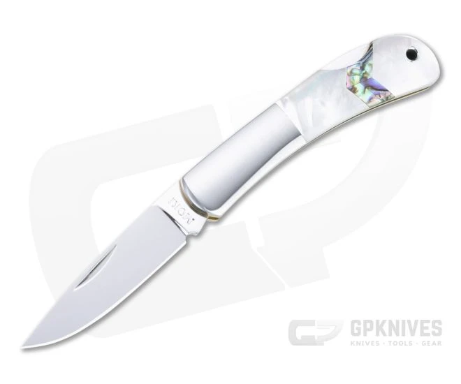 Handle: Traditional brass liner construction supports long, handsome brushed stainless steel bolsters atop beautiful mother-of-pearl covers with abalone chevron ‘arrow’ inlays. The simple back lock construction is seamless and smooth in operation for reliable lockup and secure use. This small design is ideal for shirt or watch pocket carry. A tube is provided for lanyard attachment.