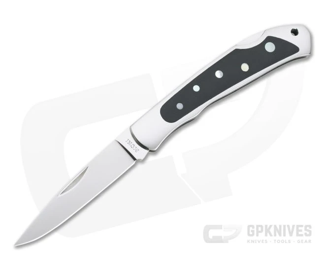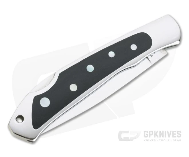 Handle: Mirror polished stainless steel houses the blade and back spring, each side being inlaid with contracting black Micarta dotted with striking mother-of-pearl. The lock back is solid and smooth for reliable operation and secure use. A hole at the pommel allows for lanyard attachment.