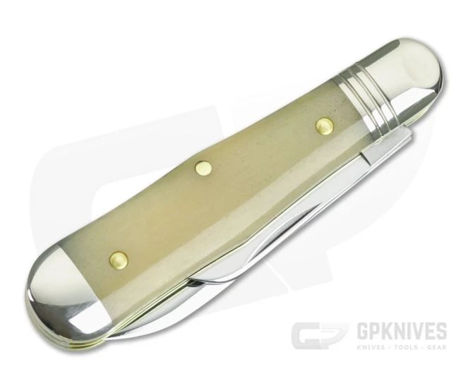 Handle: Construction of the wee lad is reminiscent of a cool glass bottle with back spring, brass liners and pins. Carefully rounded and smooth, this one is dressed in Smooth White Bone that is appealing both visually and in the hand. Rounding out the construction is a Small Badge shield and dual, polished nickel silver bolsters, pinched and grooved and the primary end. The Pemberton is sure to be a favorite for users and collectors alike.