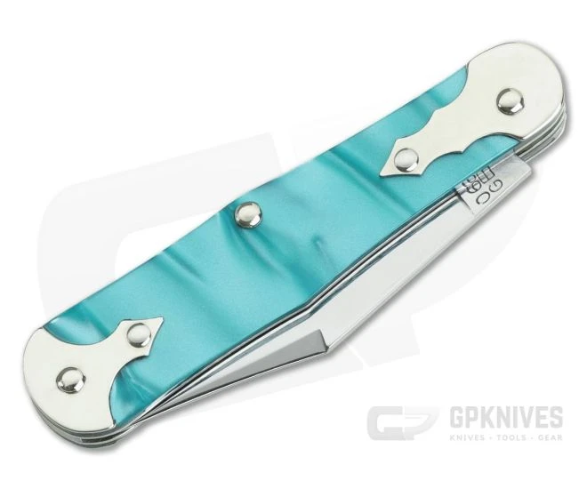 Handle: Construction of this striking piece is reminiscent of vintage glass soda bottles in shape with stainless steel back spring, liners and pins. Eye-catching blue-green Caribbean Acrylic covers are set over the stainless liners and have cutout stainless steel overlays in-place of the traditional bolsters. With plenty of visual details in play the Templar forgoes a shield altogether. The Templar is sure to be a favorite for users and collectors alike.