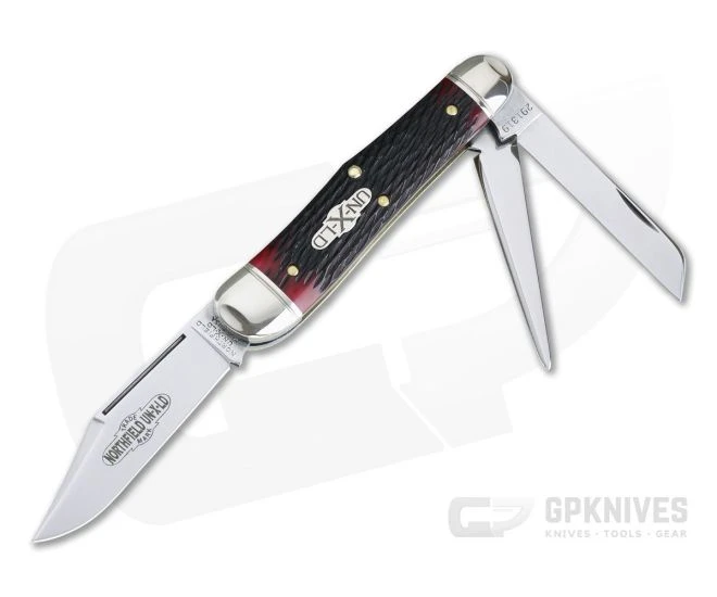 Handle: Blood Red Jigged Bone handle scales are fitted perfectly between two nickel silver bolsters. The jigged bone offers a dark, rich color and enhanced texture in the hand. All nickel silver comes with a polished finish including the UN-X-LD Shield. Brass liners and pins round out construction.