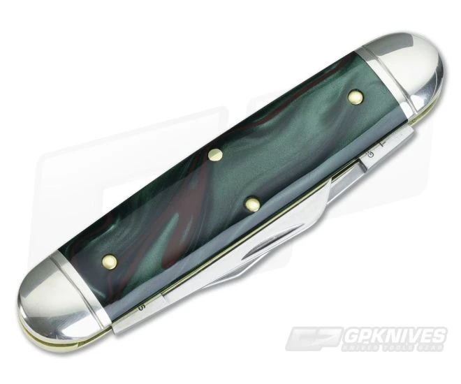 The Handle: Smooth, Hummingbird Acrylic scales have a unique look and are pinned to brass liners. The Churchill is accented with polished nickel silver bolsters and a traditional shield on the front.