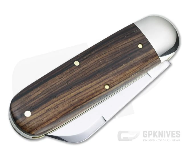 Handle: Flush fit to polished nickel silver bolsters are Cocobolo wood covers with traditional brass liner and pin construction. This large knife has a full size handle for a solid, secure grip. A Banner shield rides on the front cover while a strong stainless steel back spring delivers reliable slip joint operation. Each GEC knife ships in a sturdy tube with company information on the front.