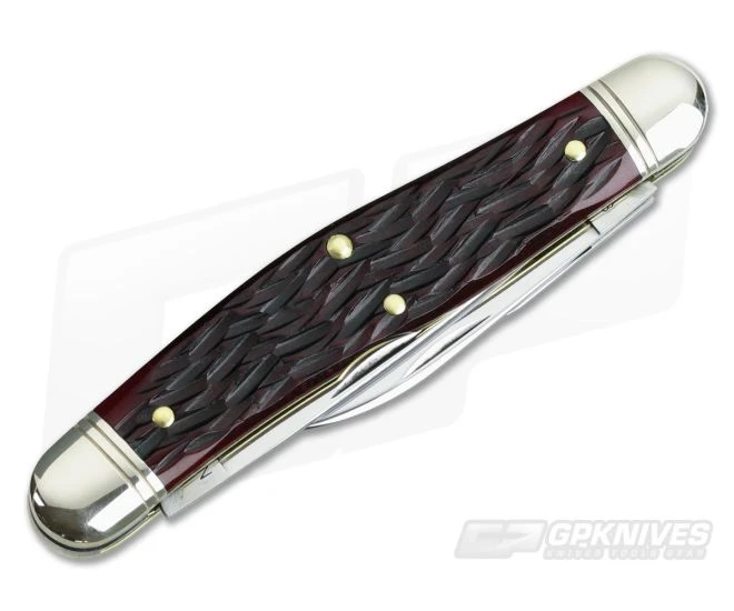 Handle: Each Stockman comes equipped with brass liners for support and wonderfully textured elderberry cattle bone scales. It has a nice bend about half way down for a comfortable cutting grip. The juicy bone has shades ranging from lighter hued maroons to nearly dark black cherry for a handsome appeal. Both grooved bolsters are crafted from nickel silver that’s been given a nice bright polished finish that compliments the scales well. Brass pins and the classic Bomb Shield round out construction on this piece.