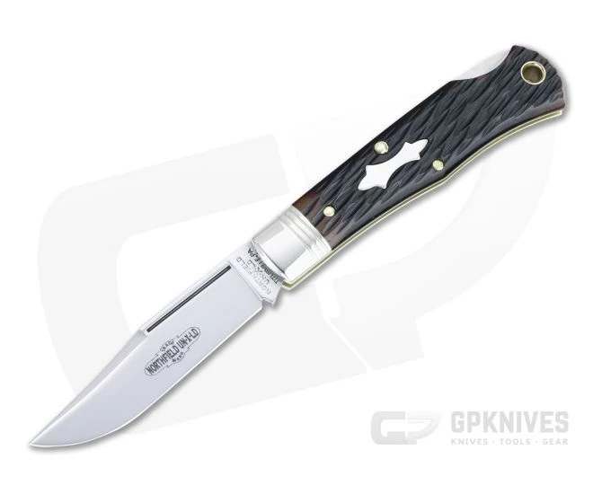 The Northfield UN-X-LD model 83 Tascosa is a classic single blade lock back jack knife with an iconic hunter style clip point blade ideal for a variety of daily cutting tasks. Quality Great Eastern Cutlery construction makes this a solid choice for users and collectors, especially with the UN-X-LD finish. This version comes with a polished satin blade and “Dark Brewed” jigged bone covers.