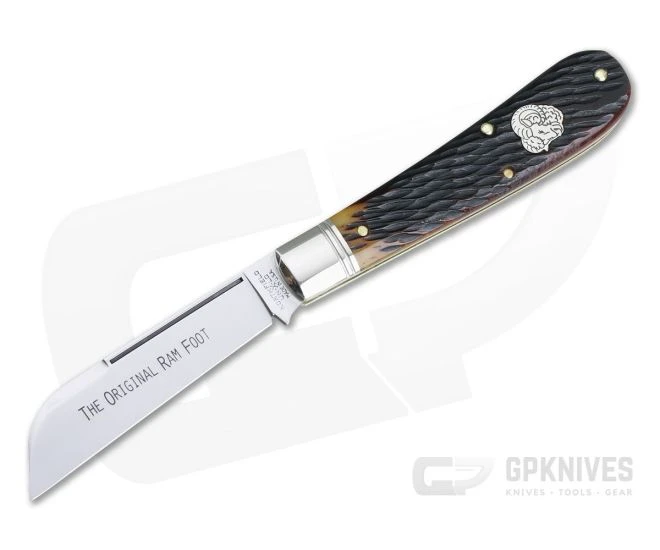 Blade: This new style from GEC blends the classic lines of the Sheepsfoot and Wharncliffe for powerful cutting potential. It is equipped with a polished finish etched with “The Original Ram Foot” and long groove pull with a subtle upper swedge with that just-right half stop action. The high carbon 1095 blade steel is tough and easy to sharpen to a razor like edge but requires care to prevent corrosion and will naturally patina over time.