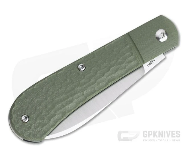 Handle: Jigged, contoured OD Green G10 scales are fit over contrasting black G10 liners lending a classic look to this high-performance modern material. Lightweight and durable, the handles are milled with a smooth, integral faux bolster and jigged ‘covers’ for traction in the hand and a classically traditional look. Construction is finished with satin titanium Torx hardware and stainless back spring.