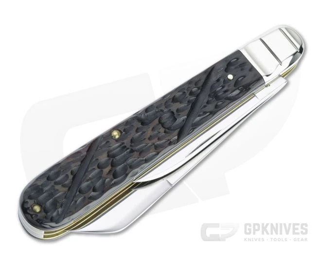 Part of a set of limited 2008 Series XVIII knives, the Bare-End English Jack knife is a large two-blade jack knife with Wharncliffe and pen blades in polished 420HC stainless steel. Polished rat tail bolsters top the Pennsylvania Brown Berry, Worn Worm Groove bone covers. Standard blade stamps and markings as shown. One of a limited 600 piece production run.