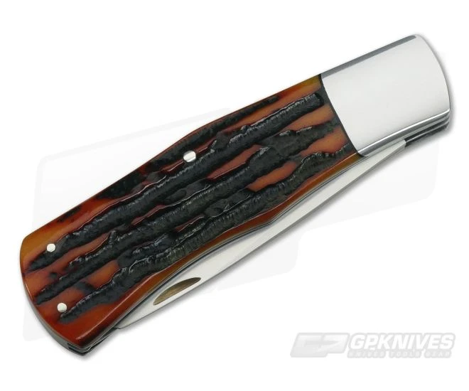 The Ray Cover Sr. Custom Double Blade Trapper is an exceptional, high quality custom piece that delivers a handsome traditional aesthetic as well as modern cutting performance. This Slip joint folder has two hand-rubbed 154CM stainless steel blades, hand fitted and pinned Amber Stag Bone handles with dovetailed stainless bolsters. This piece makes the perfect addition to any collection.