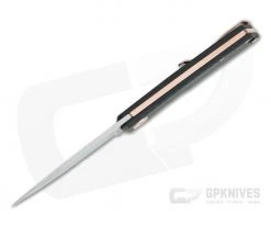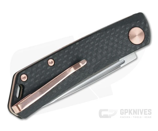 Handle: Carbon fiber slabs are machined with deep chamfers for a comfortable, contoured feel in the hand while providing a stylish and classy look for dress carry. Construction is simple with the stainless back spring and Torx hardware creating a solid, ultra lightweight platform for daily carry with added style from the rose gold PVD finish. A generous oval hole at the pommel end allows for lanyard attachment.