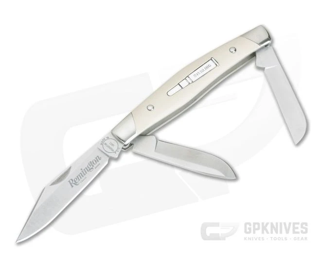 Blade: Delivered in the traditional 3-blade Stockman pattern, this folder is equipped with blades made from satin finished 420HC stainless steel with hollow saber grinds. The primary clip point blade has the Remington logo laser marked on the front and the tang is stamped with “Remington UMC” and “Made in the USA”. The reverse side has the tang marked with “2020” and the model number. Backing up the main blade are a sheepsfoot and spey blade for maximum utility.