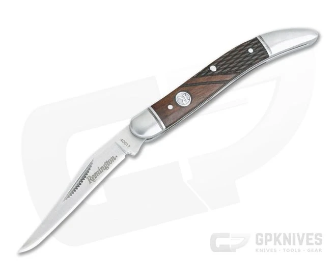 The Toothpick or “Texas Toothpick” is a classic slip joint pattern with a slim, tapering handle and a matching slim blade. This Remington Heritage Series version comes with a hollow saber ground 420J2 blade, wood covers and nickel silver bolsters.