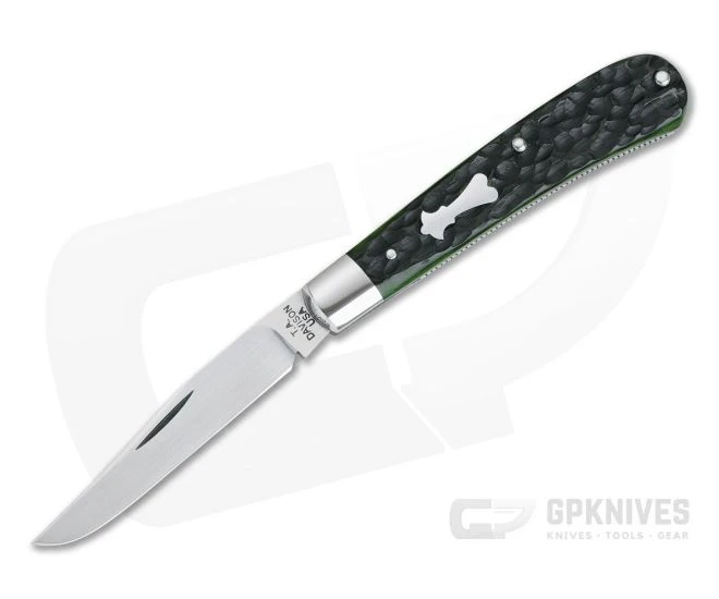 Todd Davison provides custom, traditional slipjoint pocket knives that are truly handmade and one of a kind. Having produced over 1600 slip joint knives, Davison utilizes premium materials and offers exceptional quality and attention to detail in a timeless, traditional design. This version comes with hand rubbed satin, CPM 154 clip point blade, liners and bolsters with Dark Green Jig Bone covers.