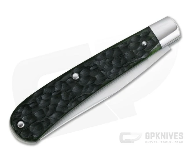 Handle: Clean and stylish, the Dark Green Jigged Bone covers are fit to satin finished, stainless steel bolsters which are precision fit to the stainless steel liners. Offering a handsome and rugged appearance, the bone covers are comfortable in the hand and the pocket. Delivering a truly custom feel is the subtle detail of file work on the inside of the back spring and coin edged liners. Stainless pins are used to secure the covers and the display side has a stainless shield for a timeless feel. The back spring is smooth and solid with half-stop action and sits flush in all three positions.