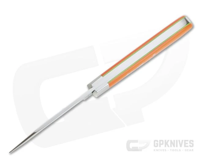 Handle: Striking Orange G10 covers over complementary green fiber liners are fit to polished stainless steel bolsters, all precision fit to the stainless steel liners. Smooth polished liners and file work on the inside of the back spring offer a truly custom feel. Stainless pins are used to secure the covers and the display side has a stainless shield for a timeless feel. The back spring is smooth and solid with half-stop action and sits flush in all three positions.