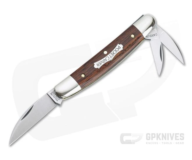 The #62 Easy Pocket Carver from Great Eastern Cutlery, is a timeless classic Congress pattern with a timeless look and feel. The traditional, shallow concave back and shallow convex top define the pattern in this three blade “carver” configuration: one medium Wharncliffe and two small Wharncliffe blades. A polished shield and bolsters add a touch of class while the contoured handle and satin blades are all business. This Tidioute version comes with Cocobolo Wood covers and Crown shield.