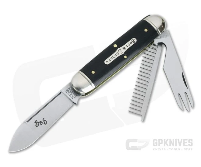 The Tidioute #35 Beer and Sausage Bar Tool from Great Eastern Cutlery is a utilitarian Jack knife pattern modified from the classic two-blade design to be more functional for the bar dwelling amongst us. Outfitted with a large, primary spear point blade this #35 is also equipped with a fork and cap lifter combo and specialized BRRT (Beard Refuse Removal Tool) a.k.a. comb. This version comes with Ebony Wood covers.