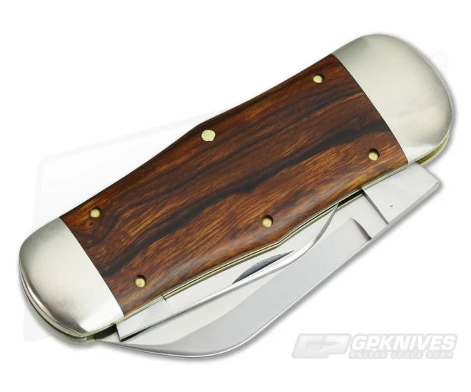 The Handle:Beautifully figured Desert Ironwood scales are framed by beefy, brushed nickel silver bolsters and attached with brass pins to brass liners. The front scale is embellished with a straight bar shield. The coffin shaped handles offer a full and ergonomic grip with a reassuring heft in the hand.