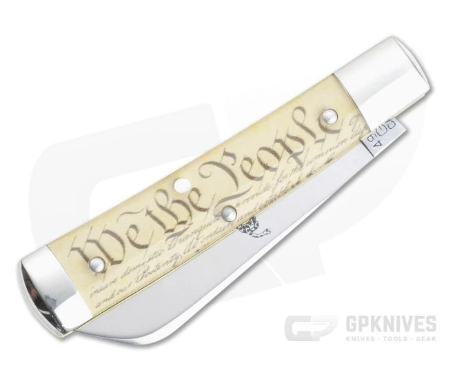 Handle: Fit perfectly between polished nickel silver bolsters are clear acrylic covers over patriotic graphics, an American Flag graphic on the front and “We The People” on the back. Construction is classic brass liner and pin with a strong stainless steel back spring for secure slip joint operation. Each GEC knife ships rolled in wax paper in a sturdy tube with company information on the front.