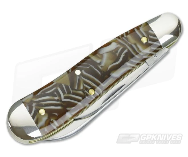 Tidioute Cutlery #56 two-blade Bird Dog Leg Jack is built to perfection the way they used to be by Great Eastern Cutlery in the USA. It’s a well-rounded medium-sized pocket knife featuring two working blades opening from the same bolster and some handsome acrylic handle scales.