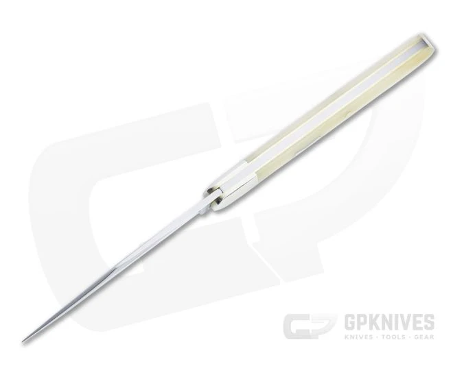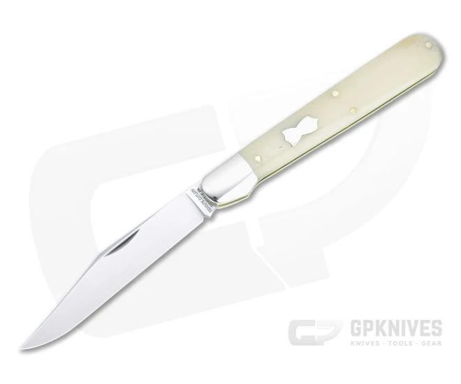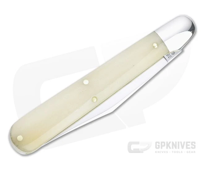 Handle: Fit perfectly to polished nickel silver bolsters are smooth white bone covers, delivering a generous handle with a gentle taper toward the blade and subtle index guard. Construction is classic brass liner and pin with a strong stainless steel back spring for secure slip joint operation. Each GEC knife ships in a sturdy tube with company information on the front.