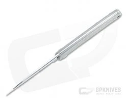 Handle: A crowned stainless steel back spring matches the spine of the blade and is fit securely between two slabs of contoured matte gray titanium with geometric texture milling. The handle design provides a secure, comfortable grip with good heft in the hand. Geometric crosshatch milling provides added traction and style, with two milled grooves forming a faux bolster as well. A hole at the pommel allows for lanyard attachment.