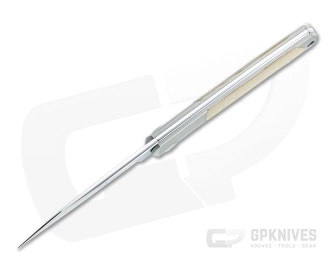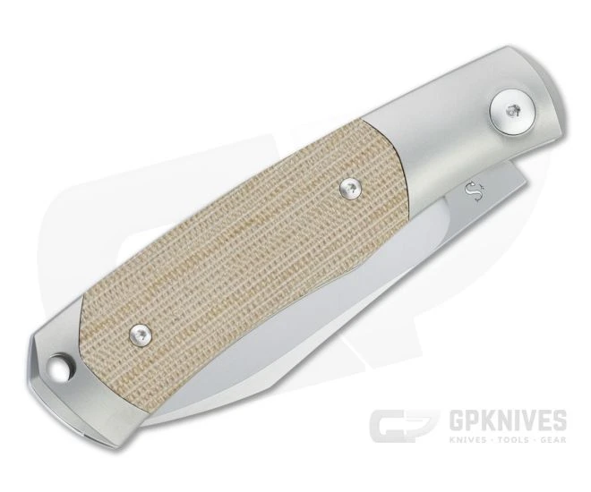 Handle: A crowned stainless steel back spring matches the spine of the blade and is fit securely between matte gray titanium liners with two integral bolsters. The liners support handsome canvas Micarta scales that offer traction and a warm feel in hand with classic style from the bolstered design. A hole at the pommel allows for lanyard attachment.