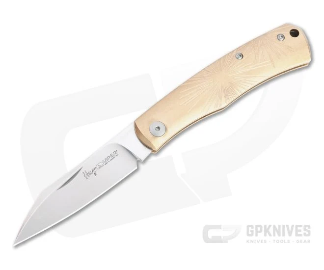Inspired by Jared Oeser’s custom Native, French custom knife maker Sacha Thiel created his first slip joint, the Birdy, elaborating on Oeser’s design. The sleek, stylish lines of the handle look and feel great, and the modified Wharncliffe blade gives the knife an aggressive appearance and functional performance. The Viper Hug is a high quality Italian production of this custom design. This version comes with a satin finished Bohler M390 blade and “Stars” pattern milled sandblasted bronze handles.